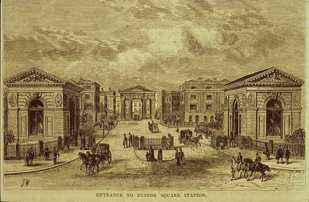A late Victorian image of the two lodges showing their original condition and their relationship to the famous ‘Arch’ in the background. Euston station itself can be seen in the distance through the arch.