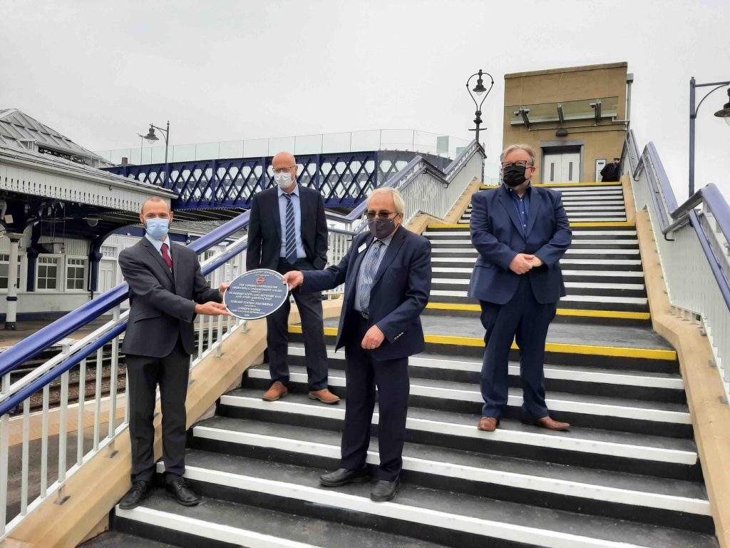 The fourth of the plaques to be officially handed over was that made for the work completed at Stirling station. Here the plaque is being formally presented by Theo Steel (centre) to Alastair MacFarlane, Network Rail Head of Engineering and Asset Management. Maintaining a safe social distance three steps back are John MacArthur, Managing Director (Scotland) of Story Contracting, on the left and David Ray, the senior sponsor for rail projects for Transport Scotland, on the right.