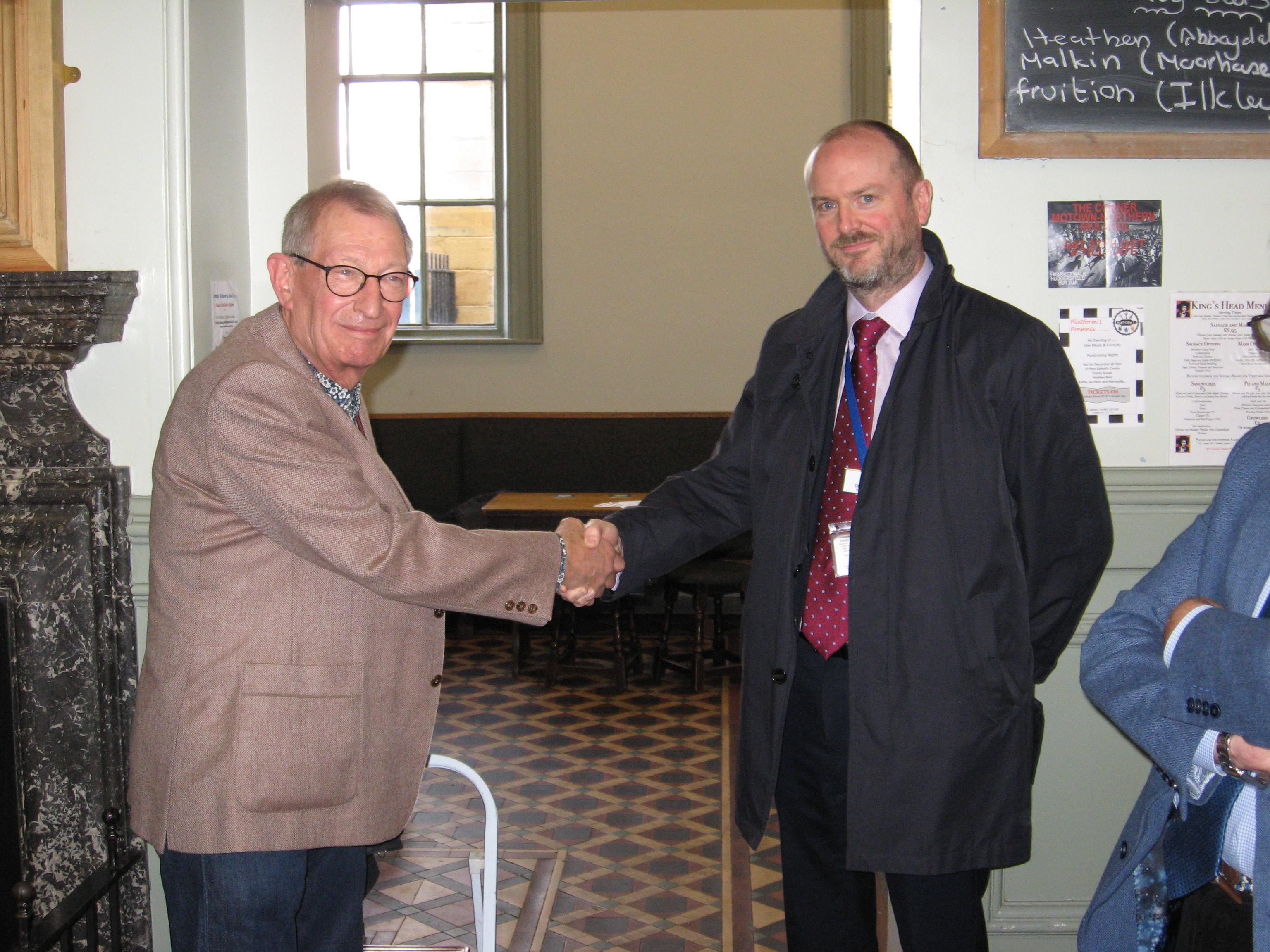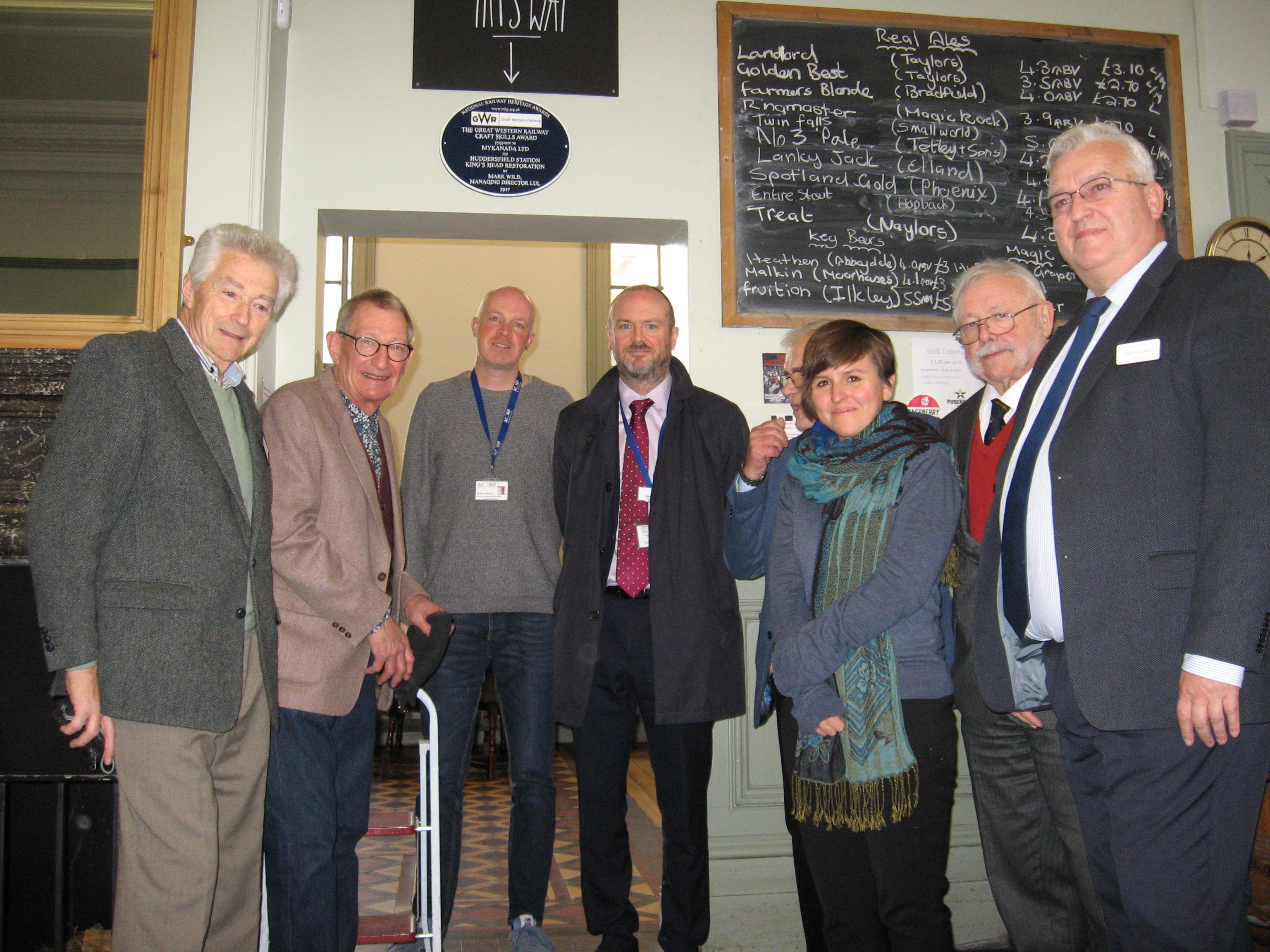 Thursday 1 November 2018 saw six members of the committee travel to Huddersfield to see the official unveiling of the plaque awarded to Mykanada Ltd for the work undertaken in converting the northern booking office at the Grade I listed station into the King’s Head public house. The plaque, which was unveiled by Oliver Turner, of Transpennine Express representing sponsor Great Western Railway, and Bruce Travis of Mykanada Ltd, was announced at the 2017 National Railway Heritage Awards in December 2017 for the outstanding work in restoring the seriously damaged fabric of this important building.
